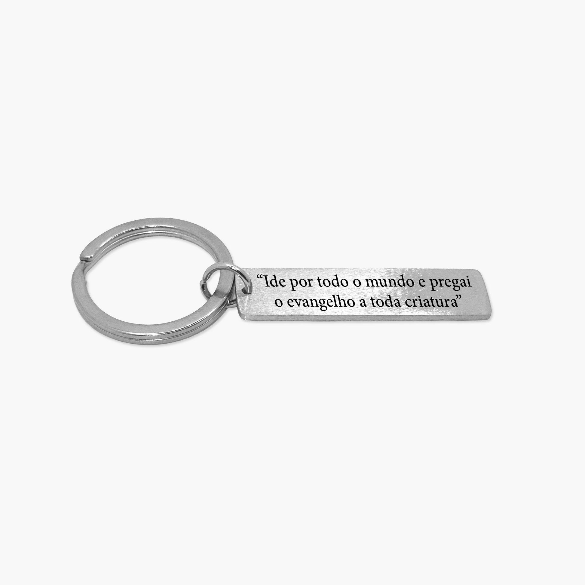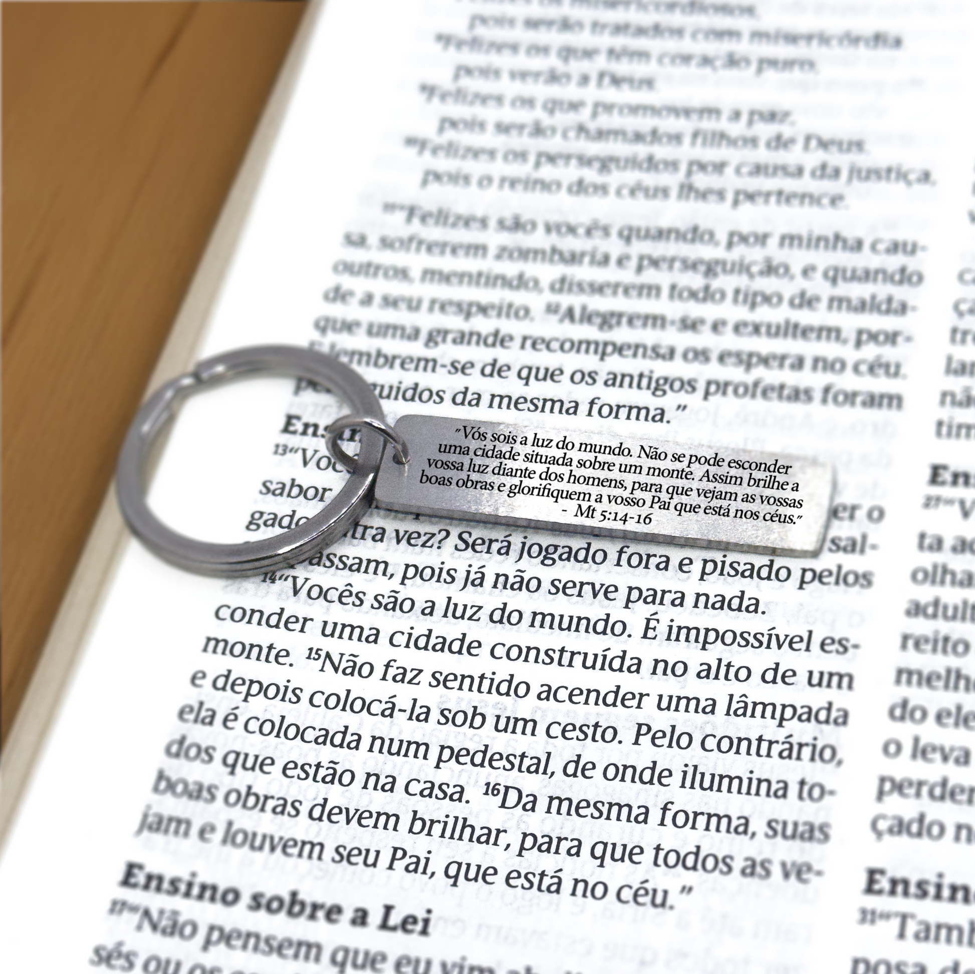 Chaveiro em formato de plaquinha, feito em aço escovado e gravado com versículos que inspiram e fortalecem a fé. Um detalhe prático e significativo para levar sempre com você.
