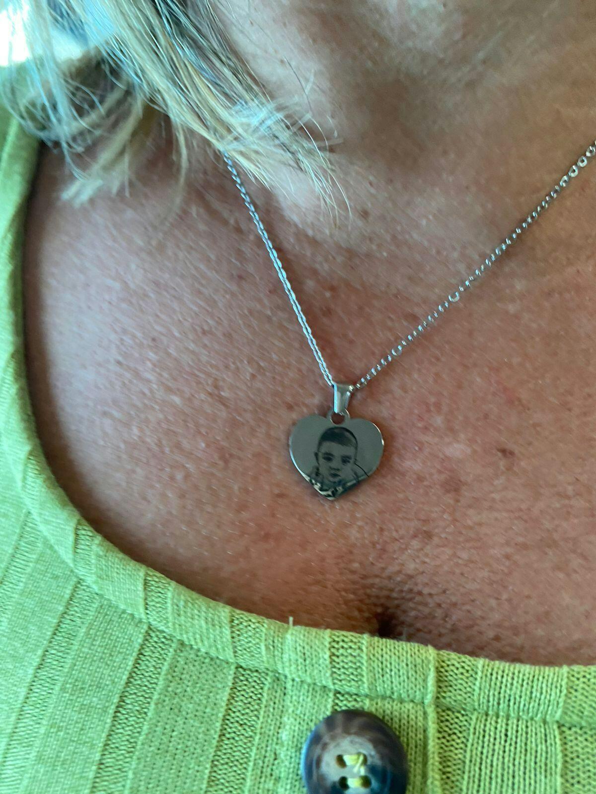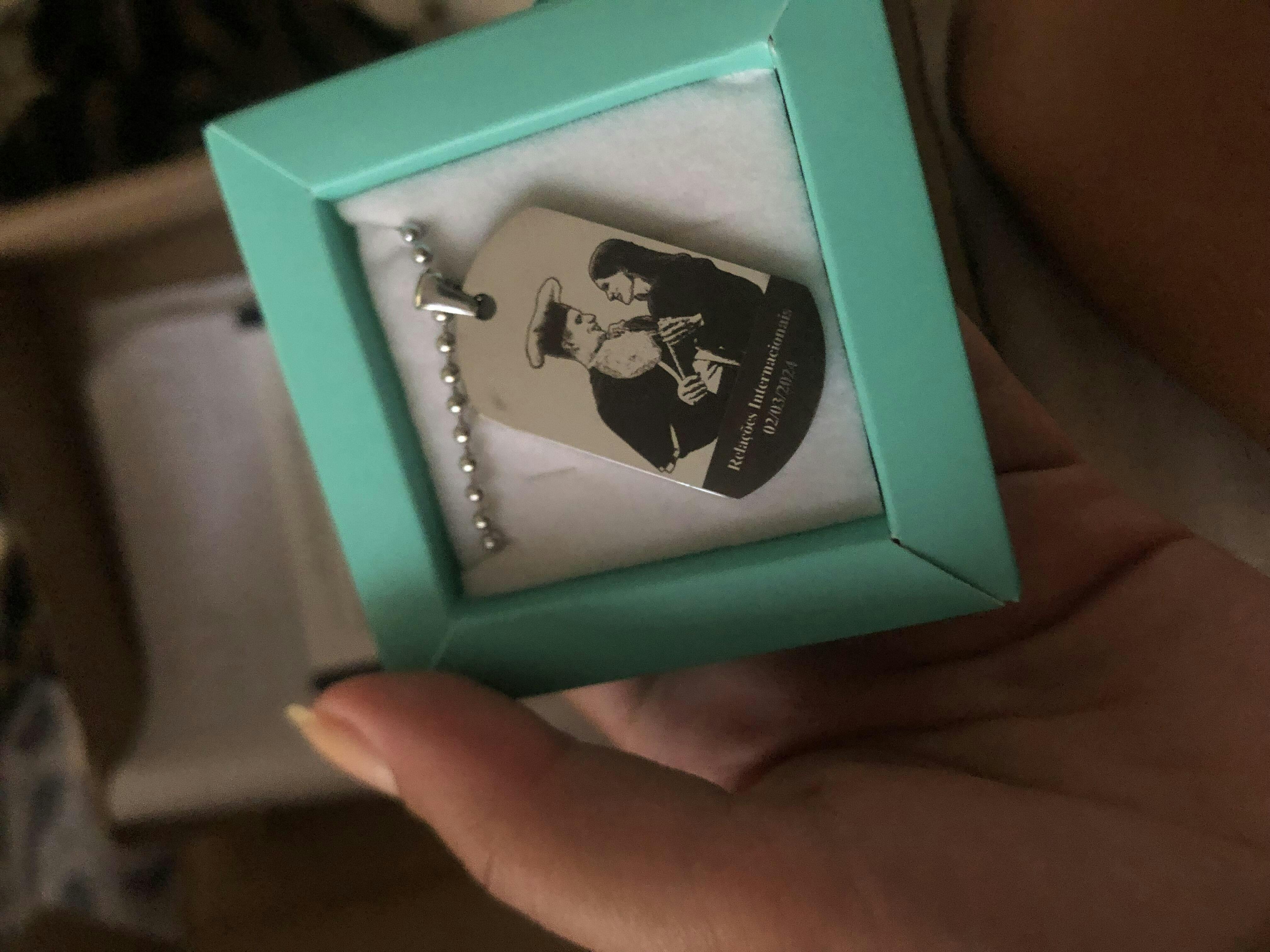 A foto é gravada na frente e o texto fica no verso do pingente.